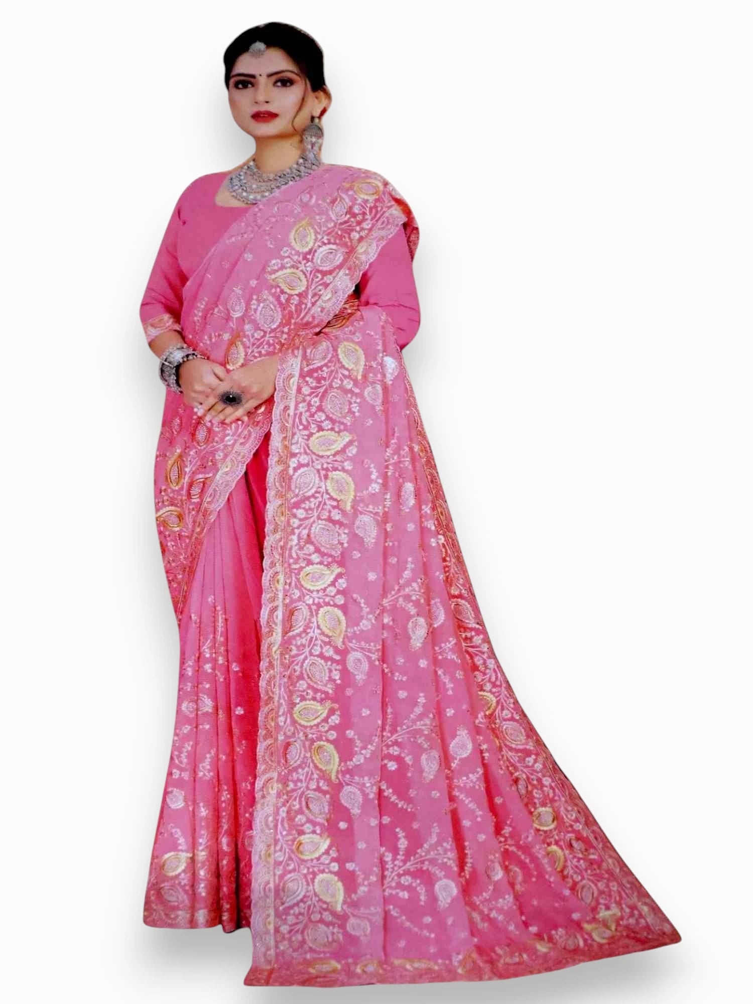 Elevate your style with our Jiarah Thread Embroidery Pink Chiffon Saree. Made with delicate chiffon fabric and intricate thread embroidery, this saree adds a touch of elegance to any occasion. Perfect for those who want to stand out from the crowd and make a statement.