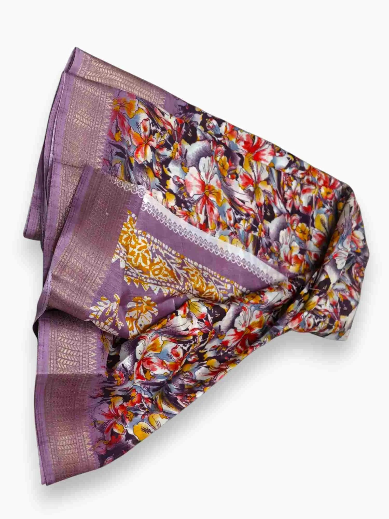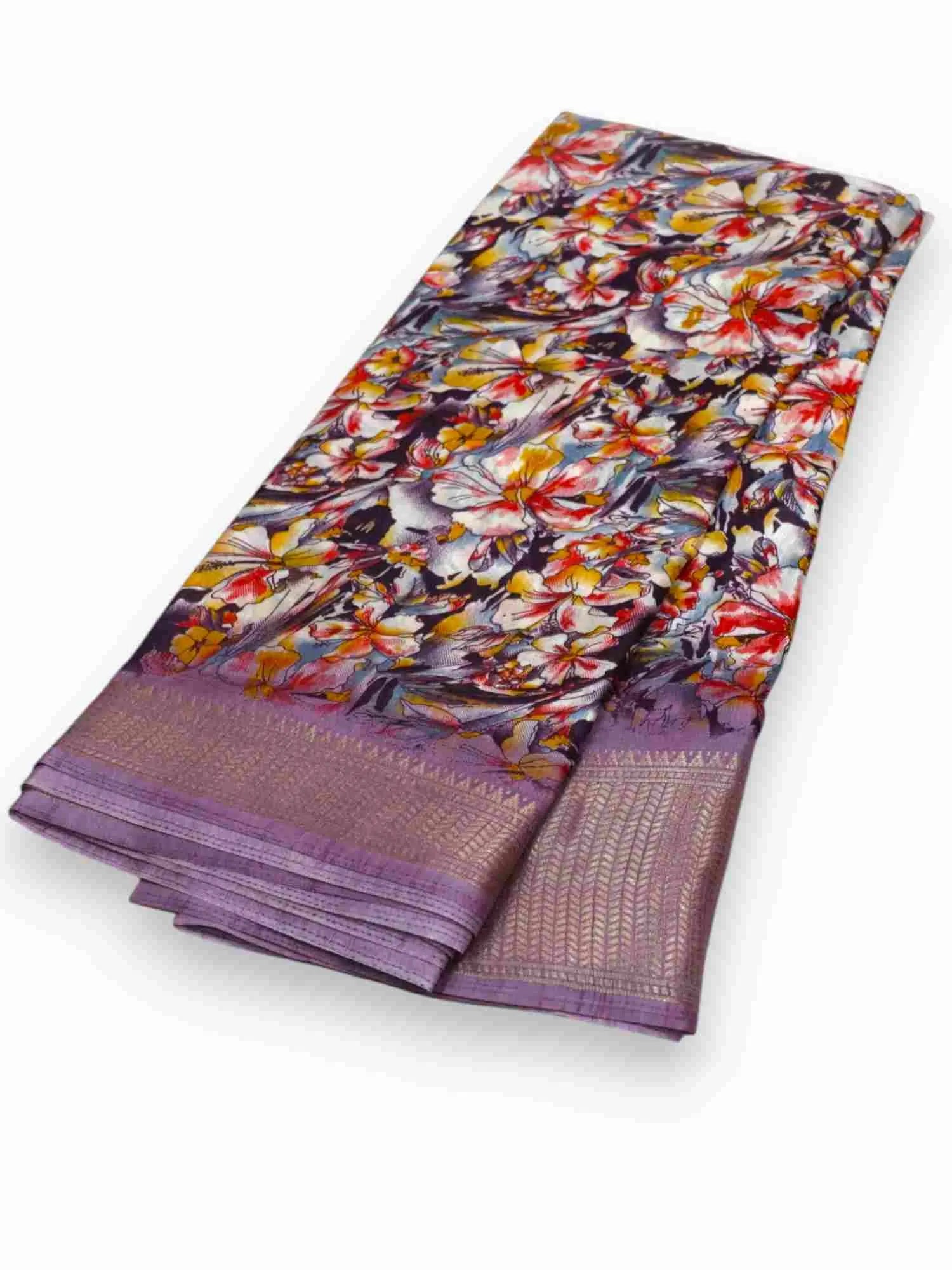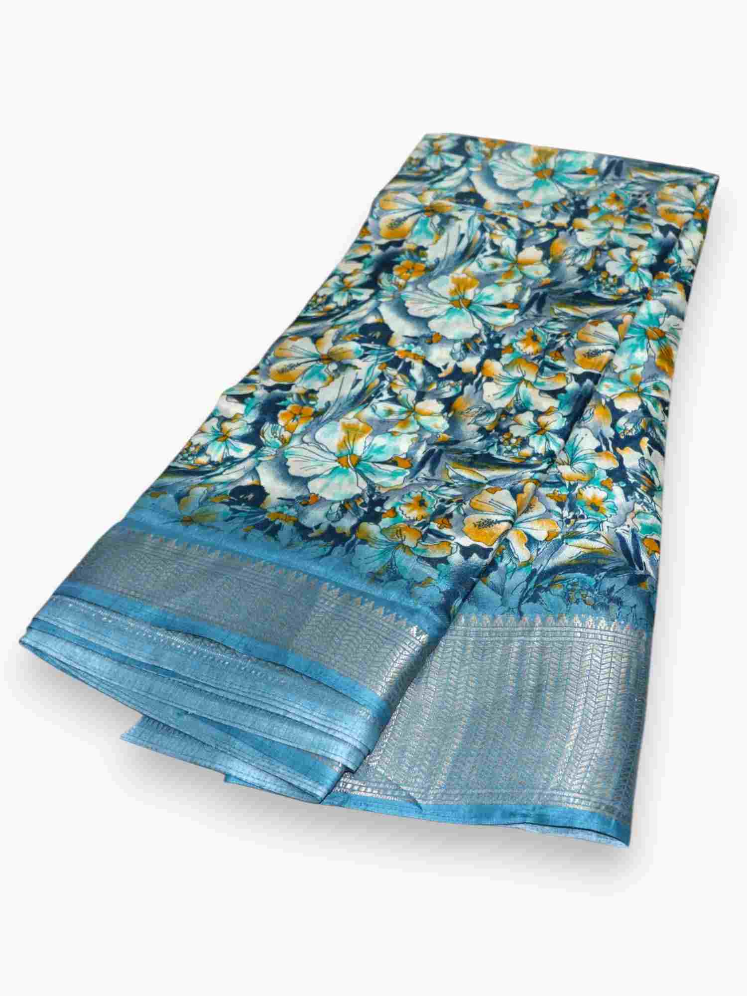 Indulge in pure luxury with our Jiarah Dola Silk saree. The exquisite floral print is beautifully complemented by a delicate Zari border, giving a touch of elegance to this traditional Indian attire. Made from the finest silk, it guarantees a comfortable and sophisticated look for any occasion.