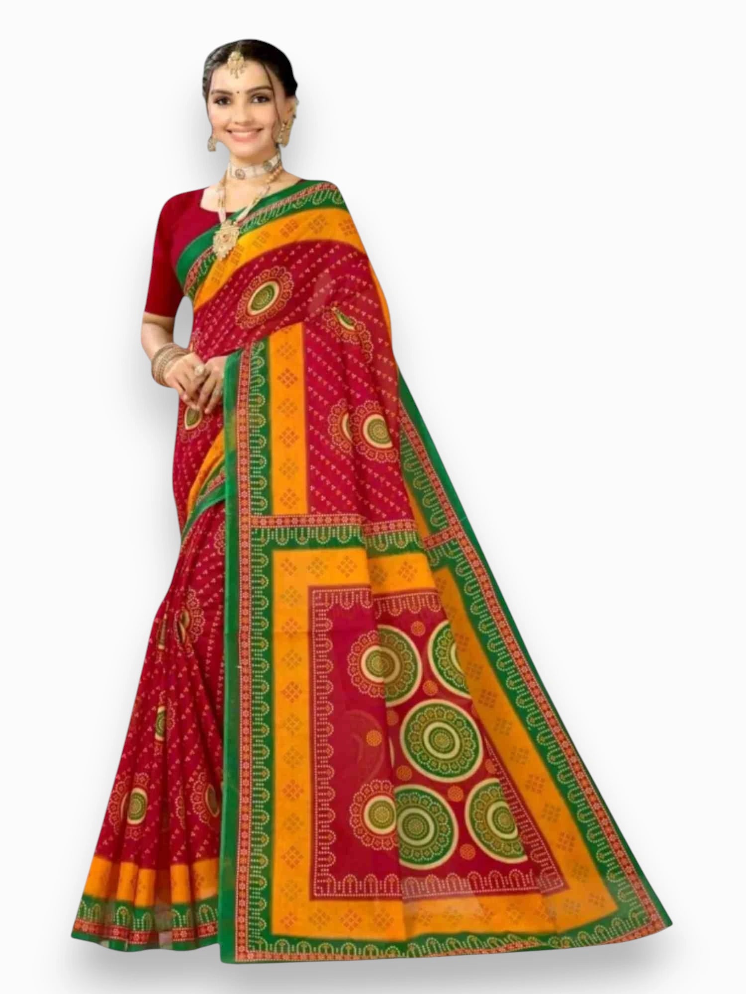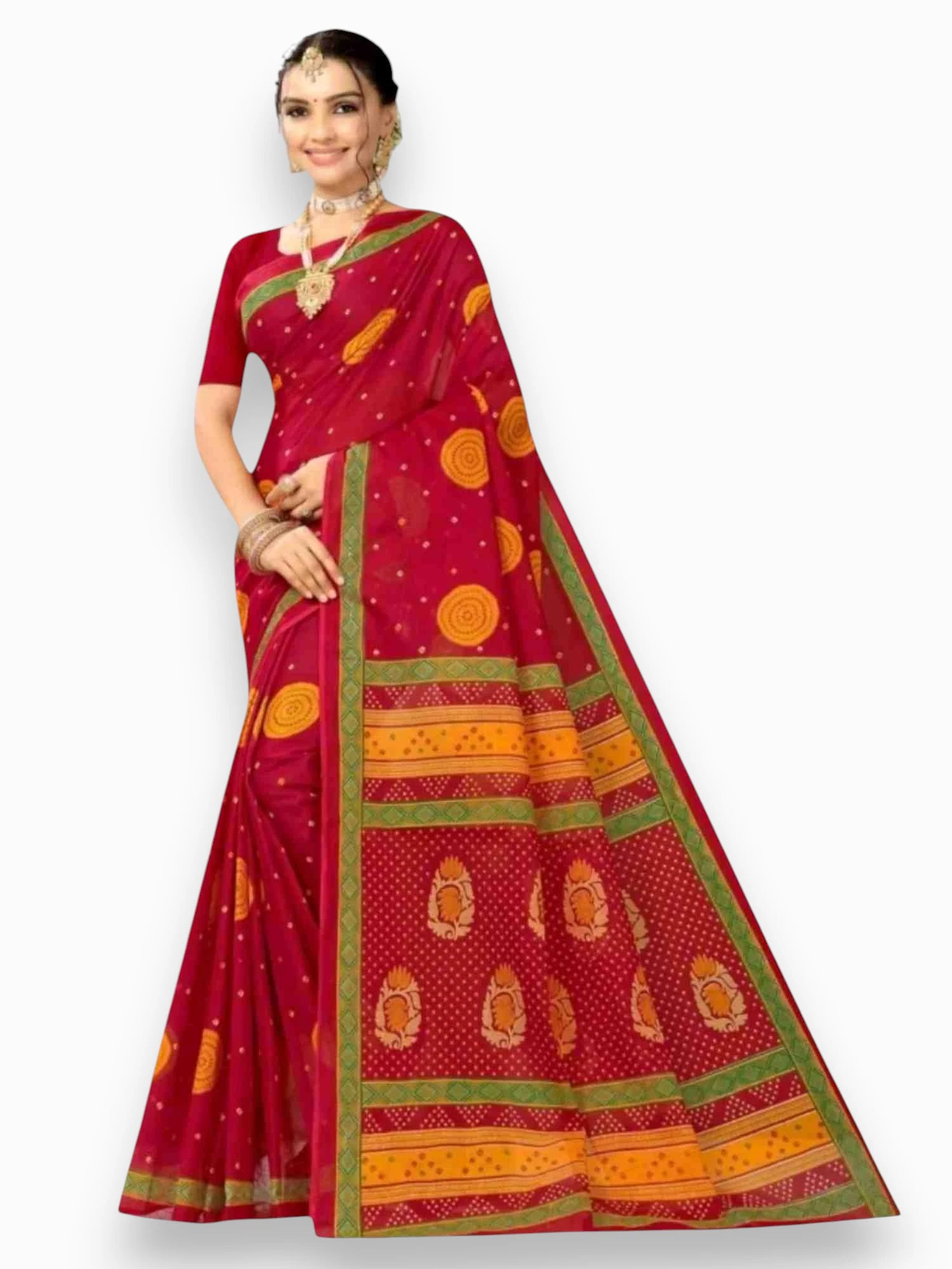 Embrace the traditional charm with our Jiarah Floral Bandhani Print Cotton Saree. Crafted from high-quality cotton, this saree features a beautiful floral bandhani print that adds a touch of elegance to any occasion. Lightweight and comfortable, it's perfect for everyday wear or special events.
