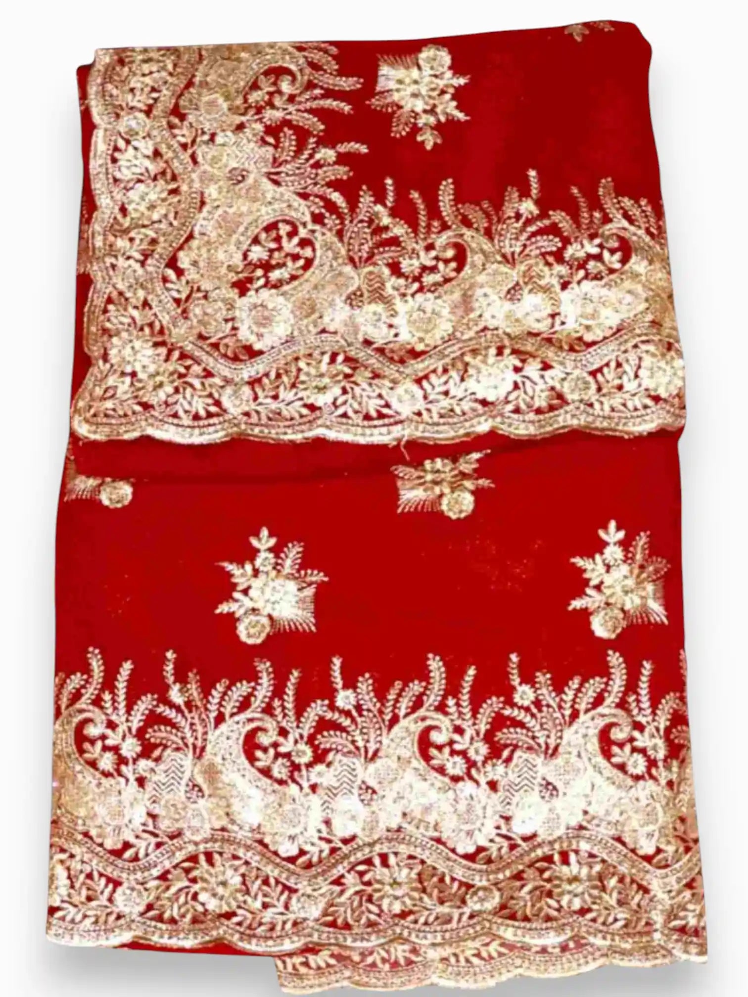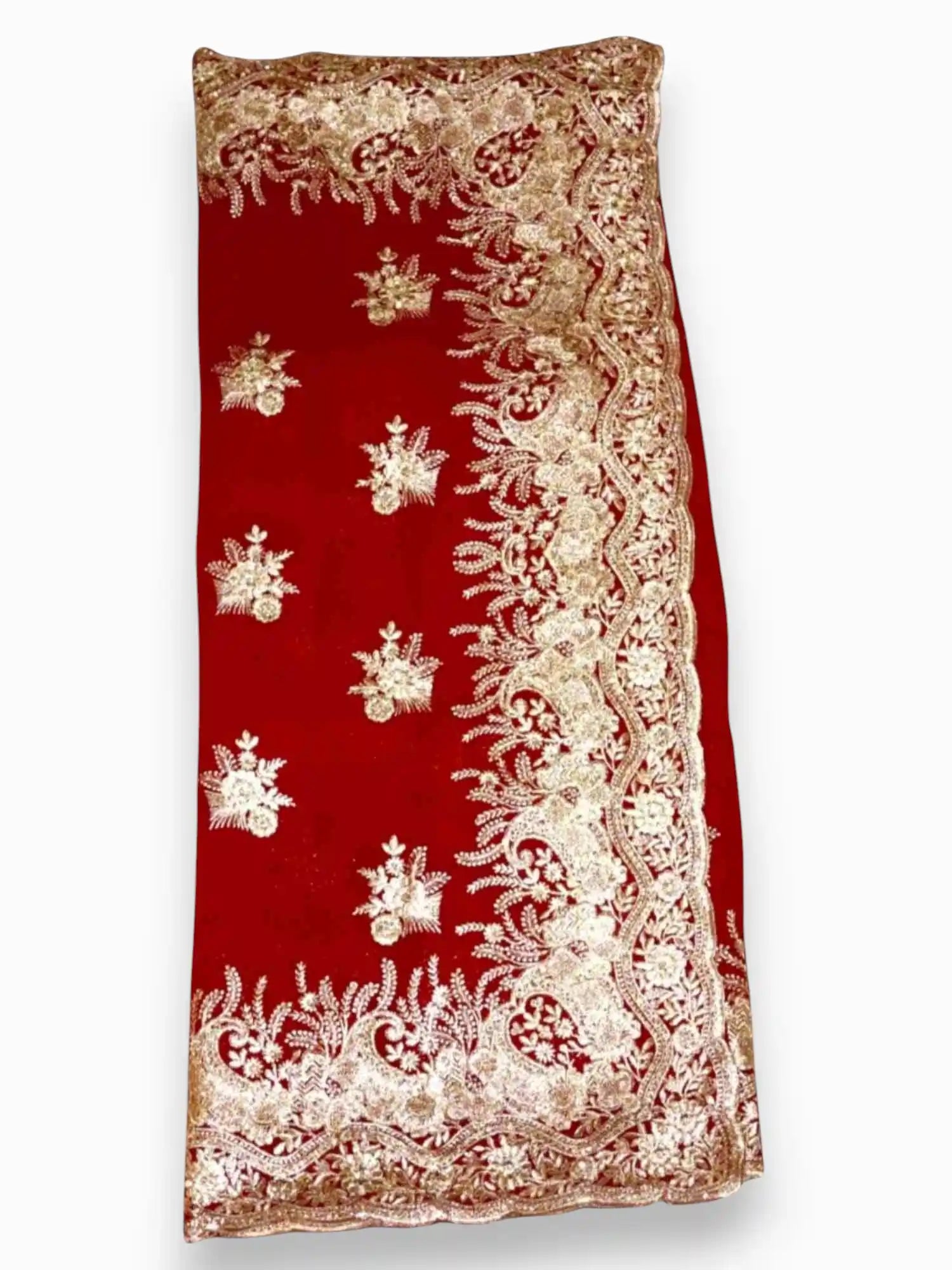 Elevate your bridal look with the Jiarah Floral Heavy Embroidery Thread Work Georgette Red Bridal Saree. With delicate embroidery and vibrant florals, this saree exudes elegance and grace. Made from high-quality georgette, it offers comfort and style that will make you the center of attention. Embrace your beauty and stand out on your special day with this stunning saree.