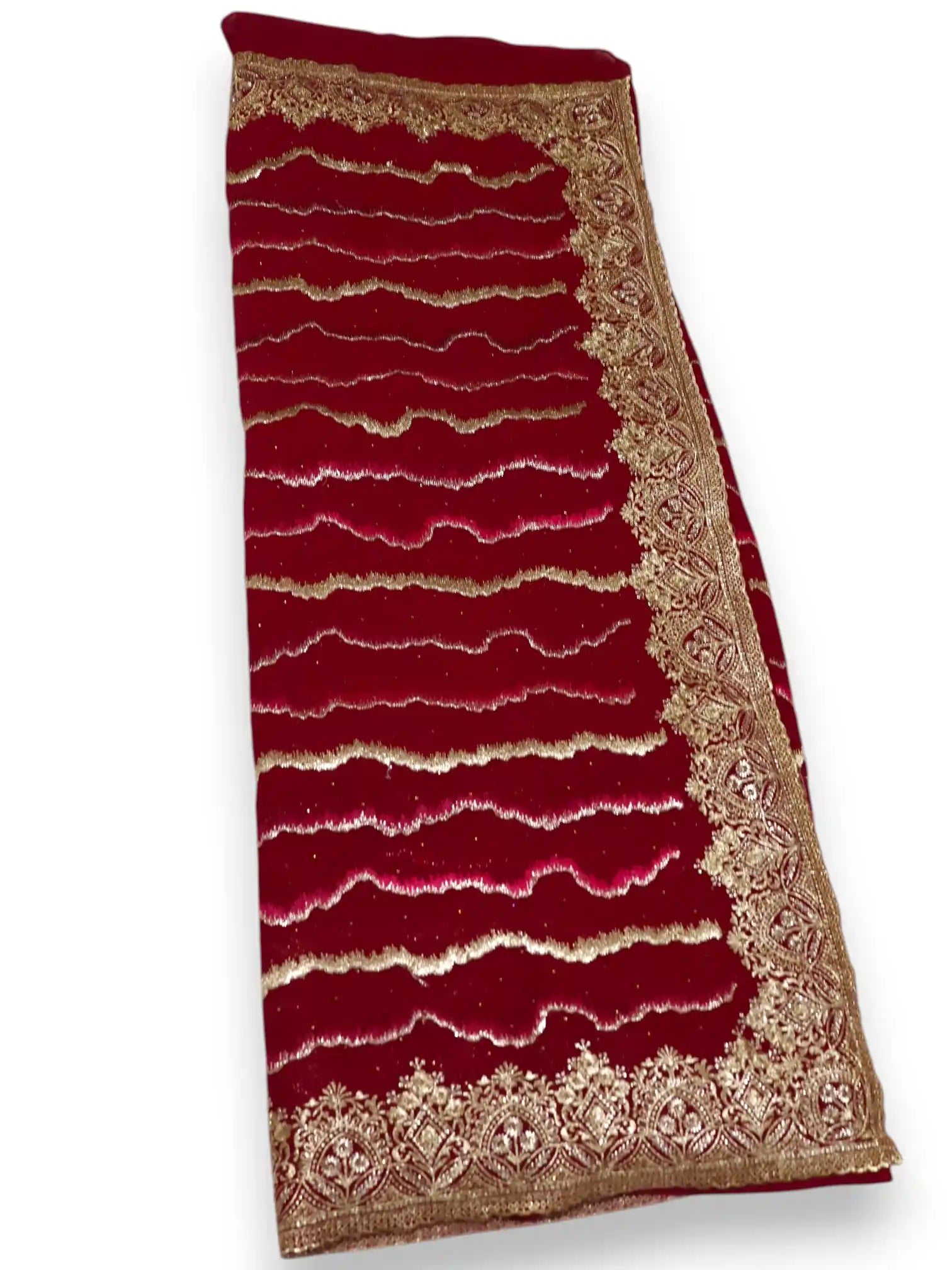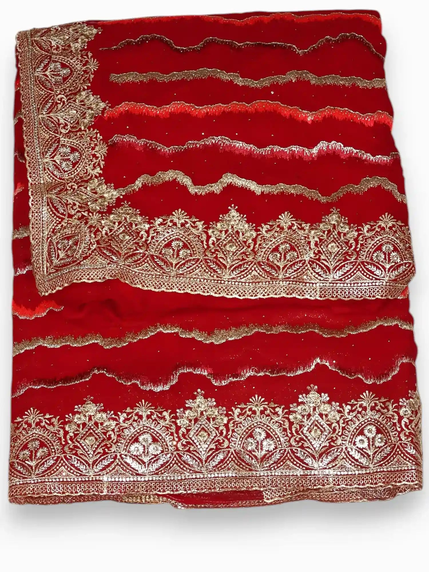 This stunning Jiarah Leheriya saree features intricate embroidery work and heavy thread detailing, making it the perfect choice for a bridal look. Made from high-quality chiffon, the saree is lightweight and comfortable to wear. Turn heads at any special occasion with this elegant and stylish piece.
