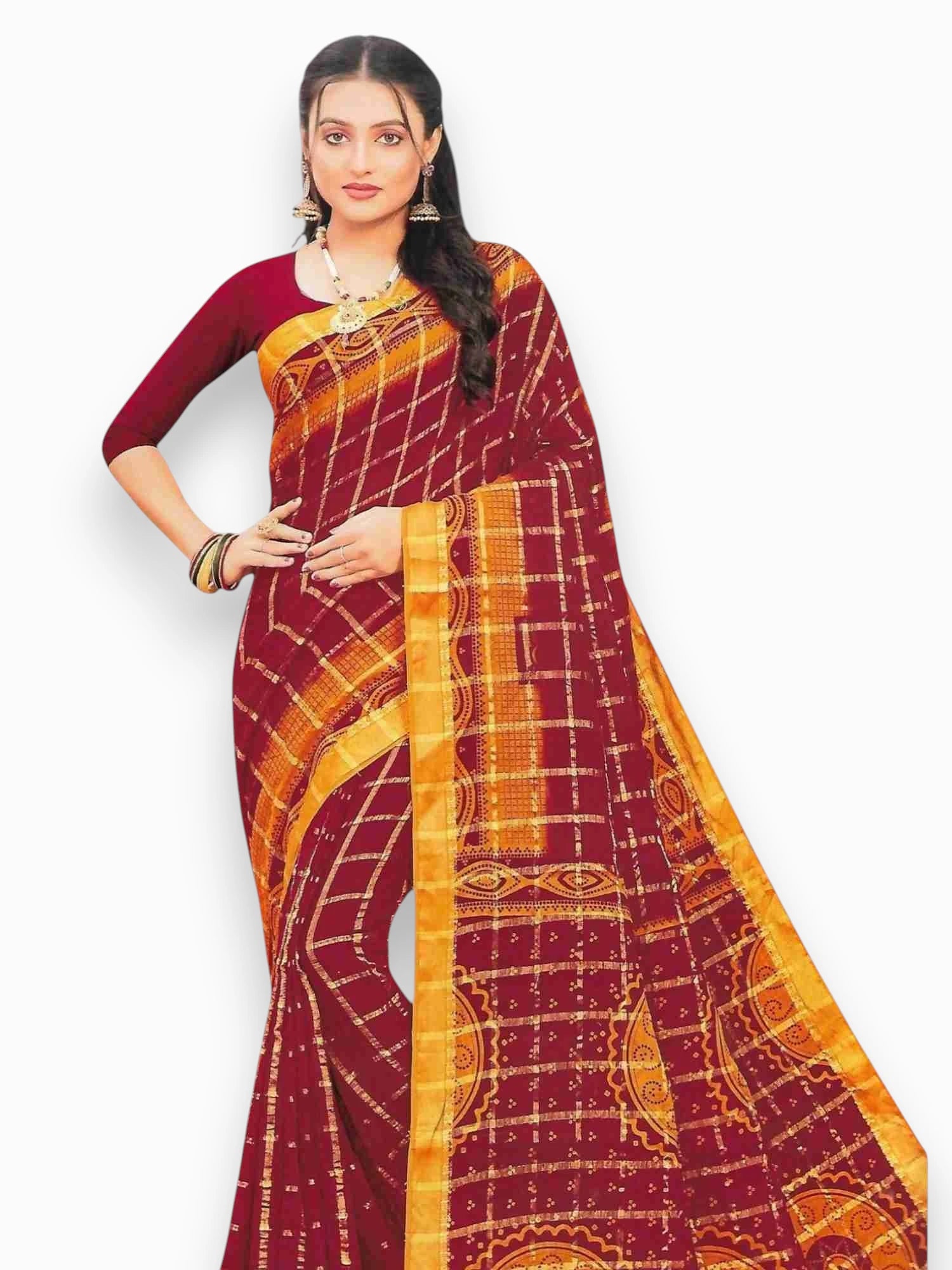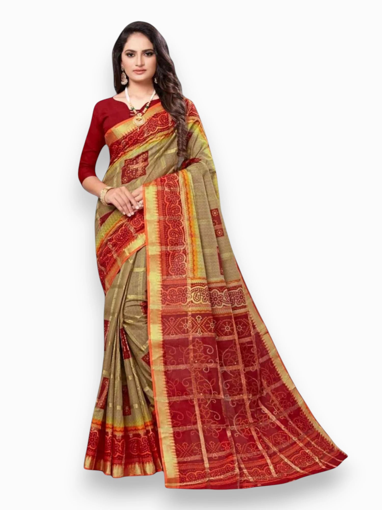The Cotton Zari Bandhani Printed Saree is perfect for summer. The cotton material is very breathable, and the Bandhani print is traditional yet trendy. The zari border adds just the right amount of glam.